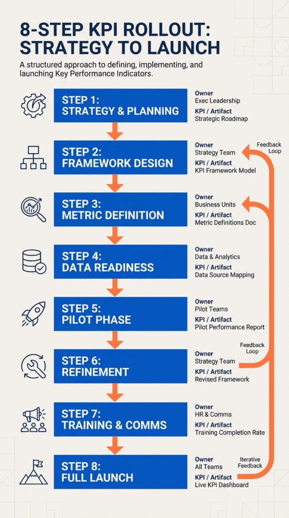 • Implement KPIs through a structured 8-step rollout process, including piloting, feedback, and clear definitions, to drive adoption and avoid confusion or resistance.